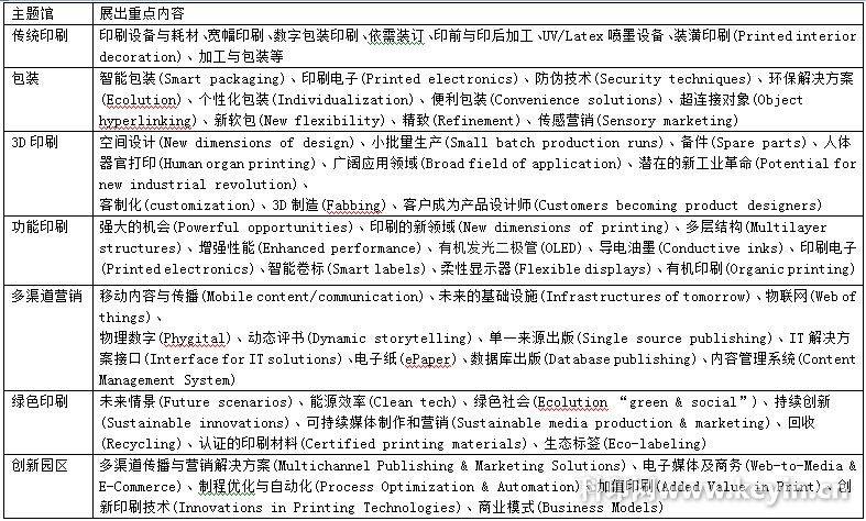 而Drupa展場(chǎng)單位經(jīng)過(guò)三次的產(chǎn)業(yè)調(diào)查報(bào)告,提出產(chǎn)業(yè)發(fā)展的六大亮點(diǎn)主題(Highlights),包括傳統(tǒng)印刷(Print)、包裝(Packaging)、3D印刷、功能印刷(Function Printing)、多渠道營(yíng)銷(Multichannel)、綠色印刷(Green Printing)等展館,還有特別展區(qū)包括創(chuàng)新園區(qū)(Innovation Park) 、觸摸包裝、專題演講、設(shè)計(jì)、電子印刷與解決方案、3D印刷等館,提供參訪者對(duì)展場(chǎng)有較重點(diǎn)性的信息掌握,這些館的展示內(nèi)容如下: