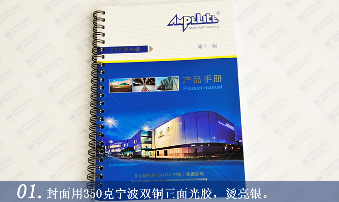 封面用350克寧波雙銅正面光膠,燙亮銀。內(nèi)頁(yè)用300克雙銅紙雙面4色彩印,黑色鐵絲圈裝。
